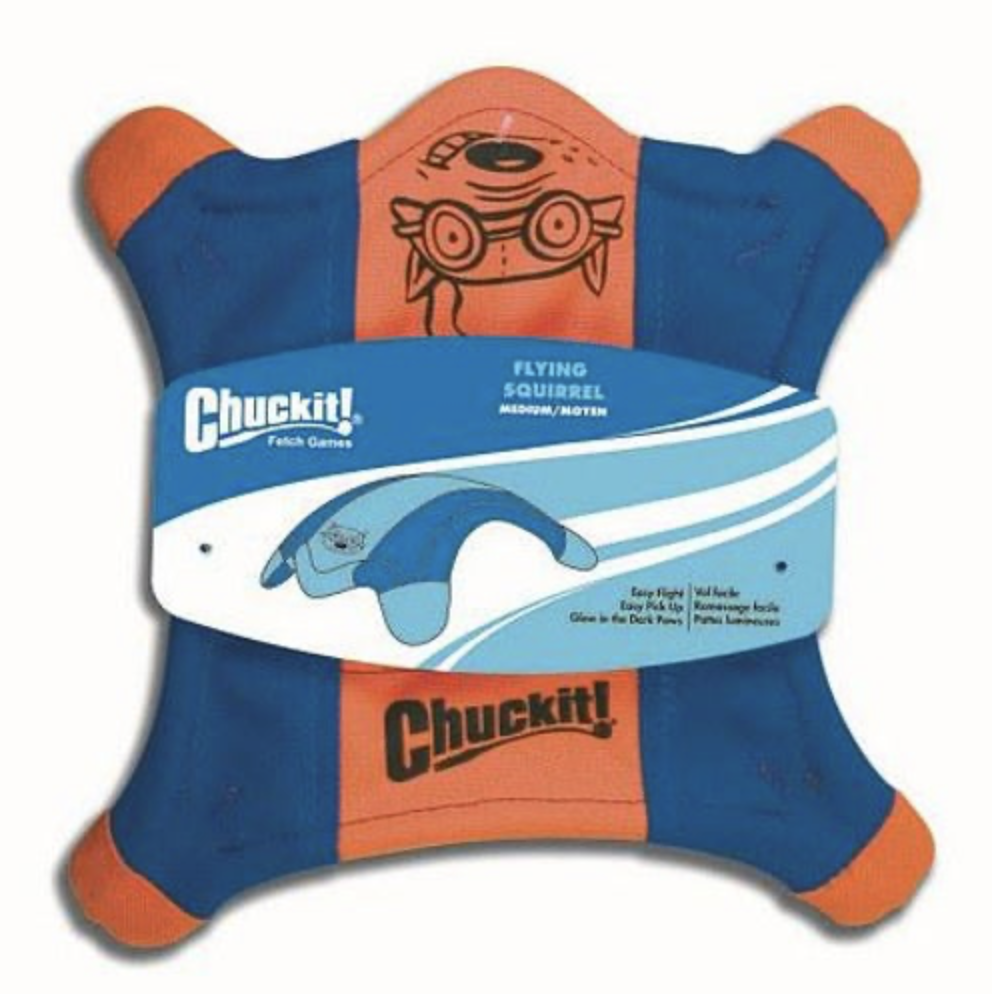 The Chuckit!® Flying Squirrel® is the ideal fetch toy for dogs that love catching flying discs! Grab the squirrel by the paw and launch it like a flying disc toy. A dog will enjoy chasing this squirrel as it soars through the air!